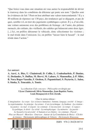 « Que feriez-vous dans une situation où vous auriez la responsabilité de dévier le tramway dans les conditions du dilemme qui porte son nom ? Quelles sont les évidences de fait ? Peut-on leur attribuer une valeur transcendantale ? Il y a 40 millions de réponses sur 130 pays, des tendances qui se dégagent, et pas de quoi, semble-t-il, en tirer des jugements synthétiques a priori. Il y a, d'un côté, une voiture autonome avec des problèmes de freinage ; de l'autre, des piétons menacés, des enfants, des vieillards, des adultes qui balancent entre deux âges. [...] Ici, on préfère détourner le véhicule, donc sélectionner les victimes ; le mal réside dans l'omission. Là, on préfère « laisser faire le hasard » : le mal réside dans l'action. »