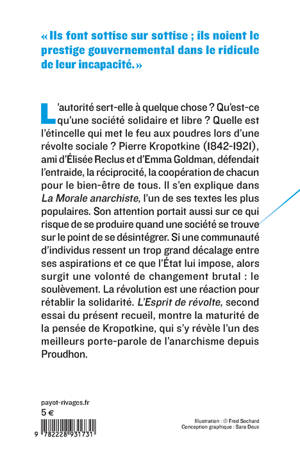 L'autorité sert-elle à quelque chose ? Qu'est-ce qu'une société solidaire et libre ? Quelle est l'étincelle qui met le feu aux poudres lors d'une révolte sociale ? Pierre Kropotkine (1842-1921), ami d'Élisée Reclus et d'Emma Goldman, défendait l'entraide, la réciprocité, la coopération de chacun pour le bien-être de tous. Il s'en explique dans "La Morale anarchiste", l'un de ses textes les plus populaires. Son attention portait aussi sur ce qui risque de se produire quand une société se trouve sur le point de se désintégrer. Si une communauté d'individus ressent un trop grand décalage entre ses aspirations et ce que lui impose l'État, alors surgit une volonté de changement brutal : le soulèvement. La révolution est une réaction pour rétablir la solidarité. "L'Esprit de révolte", second essai du présent recueil, montre la maturité de la pensée de Kropotkine, qui s'y révèle l'un des meilleurs porte- parole de l'anarchisme depuis Proudhon.