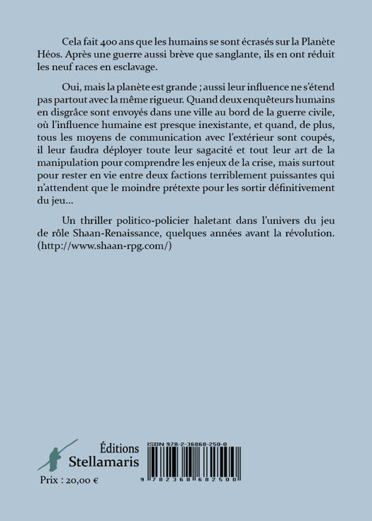 Cela fait 400 ans que les humains se sont écrasés sur la Planète Héos. Après une guerre aussi brève que sanglante, ils en ont réduit les neuf races en esclavage. Oui, mais la planète est grande ; aussi leur influence ne s’étend pas partout avec la même rigueur. Quand deux enquêteurs humains en disgrâce sont envoyés dans une ville au bord de la guerre civile, où l’influence humaine est presque inexistante, et quand, de plus, tous les moyens de communication avec l’extérieur sont coupés, il leur faudra déployer toute leur sagacité et tout leur art de la manipulation pour comprendre les enjeux de la crise, mais surtout pour rester en vie entre deux factions terriblement puissantes qui n’attendent que le moindre prétexte pour les sortir définitivement du jeu... Un thriller politico-policier haletant dans l’univers du jeu de rôle Shaan-Renaissance, quelques années avant la révolution. (http://www.shaan-rpg.com/)