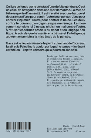 Ce livre se fonde sur le constat d'une défaite générale. C'est un essai de navigation dans une mer démontée. La mer de l'être en perte d'humanité. Il est travaillé avec une barque et deux rames : l'une pour sentir, l'autre pour penser. L'une pour contrer l'injustice, l'autre pour contrer la haine. Les deux contre le courant d'un gigantesque mensonge. Le mou¬vement consiste ici à ne pas choisir un mal contre l'autre. À refuser les termes officiels du débat et du langage poli¬tique. À voir de quelle manière la bêtise et l'intelligence oeuvrent ensemble à la mise à sac de la pensée. Gaza est le lieu où s'exerce le point culminant de l'horreur ; Israël et la Palestine le goulot par lequel le temps — le récent et l'ancien — rejette l'histoire qui a pourri en son sein.