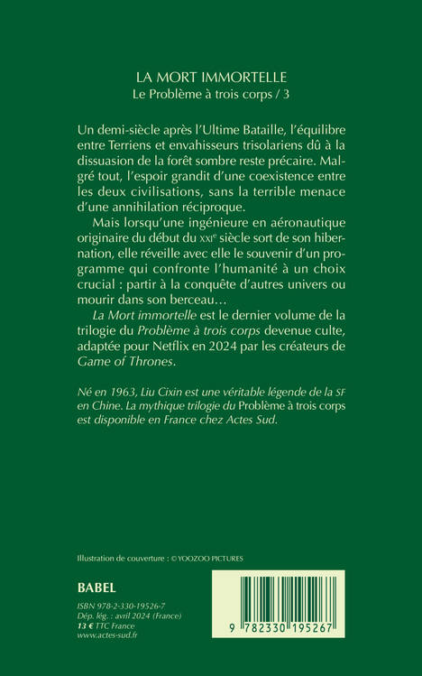 Un demi-siècle après l'Ultime Bataille, l'équilibre entre Terriens et envahisseurs trisolariens dû à la dissuasion de la forêt sombre reste précaire. Malgré tout, l'espoir grandit d'une coexistence entre les deux civilisations, sans la terrible menace d'une annihilation réciproque. Mais lorsqu'une ingénieure en aéronautique originaire du début du XXIe siècle sort de son hibernation, elle réveille avec elle le souvenir d'un programme qui confronte l'humanité à un choix crucial : partir à la conquête d'autres univers ou mourir dans son berceau... "La Mort immortelle" est le dernier volume de la trilogie du "Problème à trois corps" devenue culte, adaptée pour Netflix en 2024 par les créateurs de "Game of Thrones".