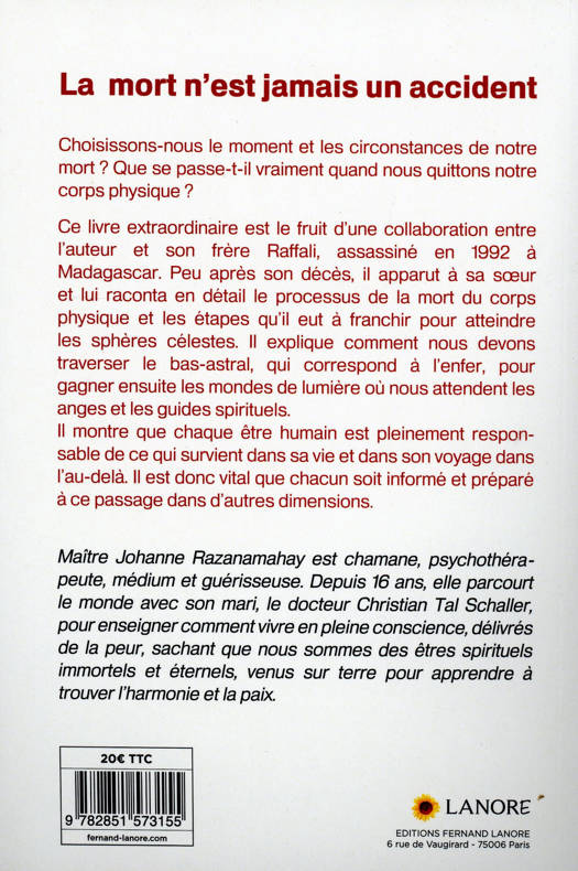 Choisissons-nous le moment et les circonstances de notre mort ? Que se passe-t-il vraiment quand nous quittons notre corps physique ? Ce livre extraordinaire est le fruit d'une collaboration entre l'auteur et son frère Raffali, assassiné en 1992 à Madagascar. Peu après son décès, il apparut à sa sœur et lui raconta en détail le processus de la mort du corps physique et les étapes qu'il eut à franchir pour atteindre les sphères célestes. Il explique comment nous devons traverser le bas-astral, qui correspond à l'enfer, pour gagner ensuite les mondes de lumière où nous attendent les anges et les guides spirituels. Il montre que chaque être humain est pleinement responsable de ce qui survient dans sa vie et dans son voyage dans l'au-delà. Il est donc vital que chacun soit informé et préparé à ce passage dans d'autres dimensions.