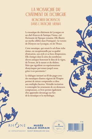 La mosaïque du châtiment de Lycurgue est un chef d’œuvre de l’antique Vienna, cité florissante de l’époque romaine. Elle illustre un mythe célèbre dans l’Antiquité : la victoire de Dionysos sur Lycurgue, roi de Thrace. Cette mosaïque, qui ornait le sol d’une riche domus, est exceptionnelle par sa qualité d’exécution, son style et sa force d’expression. Elle s’intègre dans la série des nombreux décors antiques honorant le dieu de la vigne, de l’ivresse, de la nature et du théâtre. Mais que signifient ces représentations dionysiaques parvenues jusqu’à nous grâce à ces pavements ? Le dialogue instauré au fil des pages avec des mosaïques d’autres régions de l’Empire permet de mieux comprendre ce dieu aux multiples facettes. Véritable invitation à contempler les ornements de ces demeures somptueuses, ce livre permet également d’en apprendre davantage sur l’art de la mosaïque et la mythologie.