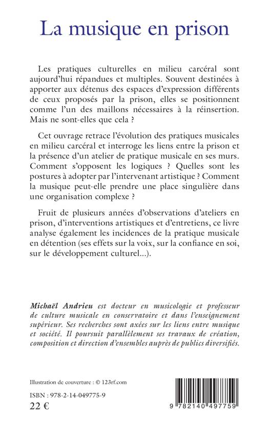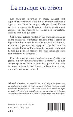Les pratiques culturelles en milieu carcéral sont aujourd'hui répandues et multiples. Souvent destinées à apporter aux détenus des espaces d'expression différents de ceux proposés par la prison, elles se positionnent comme l'un des maillons nécessaires à la réinsertion. Mais ne sont-elles que cela ? Cet ouvrage retrace l'évolution des pratiques musicales en milieu carcéral et interroge les liens entre la prison et la présence d'un atelier de pratique musicale en ses murs. Comment s'opposent les logiques ? Quelles sont les postures à adopter par l'intervenant artistique ? Comment la musique peut-elle prendre une place singulière dans une organisation complexe ? Fruit de plusieurs années d'observations d'ateliers en prison, d'interventions artistiques et d'entretiens, ce livre analyse également les incidences de la pratique musicale en détention (ses effets sur la voix, sur la confiance en soi, sur le développement culturel...).