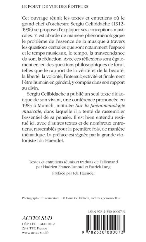 La pensée et l'art du grand chef d'orchestre Sergiu Celibidache révélés par ses textes. Sergiu Celibidache a publié un seul texte de son vivant, une conférence prononcée en 1985 à Munich, intitulée «Sur la phénoménologie de la musique» et où il a tenté de rassembler l'essentiel de sa pensée. Il est bien entendu restitué ici, avec de nombreux entretiens rassemblés ici pour la première fois. La préface est signée de la grande violoniste Ida Haendel.