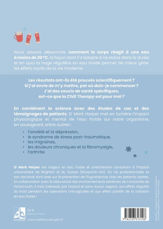 Nous savons désormais comment le corps réagit à une eau à moins de 20 °C, la façon dont il s’adapte à ce stress dans la durée et en quoi la nage régulière en eau froide permet de mieux gérer les effets nocifs de la vie moderne. Les résultats ont-ils été prouvés scientifiquement ? Si j’ai envie de m’y mettre, par où dois-je commencer ? J’ai des soucis de santé spécifiques, est-ce que la Chill Therapy est pour moi ? En combinant la science avec des études de cas et des témoignages de patients, Dr Mark Harper met en lumière l’impact physiologique et mental de l’eau froide sur nous, en soulageant, entre autres : l’anxiété et la dépression, le syndrome de stress post-traumatique, les migraines, les douleurs chroniques et la fibromyalgie, l’arthrite.