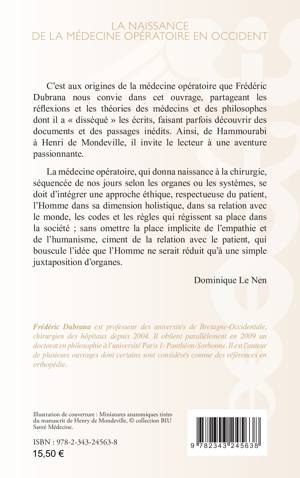 C’est aux origines de la médecine opératoire que Frédéric Dubrana nous convie dans cet ouvrage, partageant les réflexions et les théories des médecins et des philosophes dont il a « disséqué » les écrits. Ainsi, de Hammourabi à Henri de Mondeville, il invite le lecteur à une aventure passionnante. La médecine opératoire, qui donna naissance à la chirurgie se doit d’intégrer une approche éthique, respectueuse du patient, l’Homme dans sa dimension holistique ; sans omettre la place implicite de l’empathie et de l’humanisme, ciment de la relation avec le patient, qui bouscule l’idée que l’Homme ne serait réduit qu’à une simple juxtaposition d’organes.