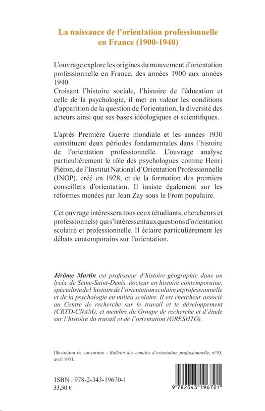 L'ouvrage explore les origines du mouvement d'orientation professionnelle en France, des années 1900 aux années 1940. Croisant l'histoire sociale, l'histoire de l'éducation et celle de la psychologie, il met en valeur les conditions d'apparition de la question de l'orientation, la diversité des acteurs ainsi que ses bases idéologiques et scientifiques. L'après Première Guerre mondiale et les années 1930 constituent deux périodes fondamentales dans l'histoire de l'orientation professionnelle.