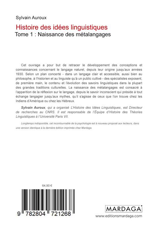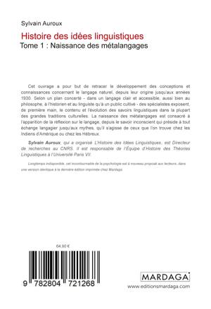 Cet ouvrage a pour but de retracer le développement des conceptions et connaissances concernant le langage naturel, depuis leur origine jusqu'aux années 1930. Selon un plan concerté - dans un langage clair et accessible, aussi bien au philosophe, à l'historien et au linguiste qu'à un public cultivé - des spécialistes exposent, de première main, le contenu et l'évolution des savoirs linguistiques dans la plupart des grandes traditions culturelles. La naissance des métalangages est consacré à l'apparition de la réflexion sur le langage, depuis le savoir inconscient qui préside à tout échange langagier jusqu'aux mythes, qu'il s'agisse de ceux que l'on trouve chez les Indiens d'Amérique ou chez les Hébreux. Sylvain Auroux, qui a organisé L'Histoire des Idées Linguistiques, est Directeur de recherches au CNRS. Il est responsable de l'Équipe d'Histoire des Théories Linguistiques à l'Université Paris VII.