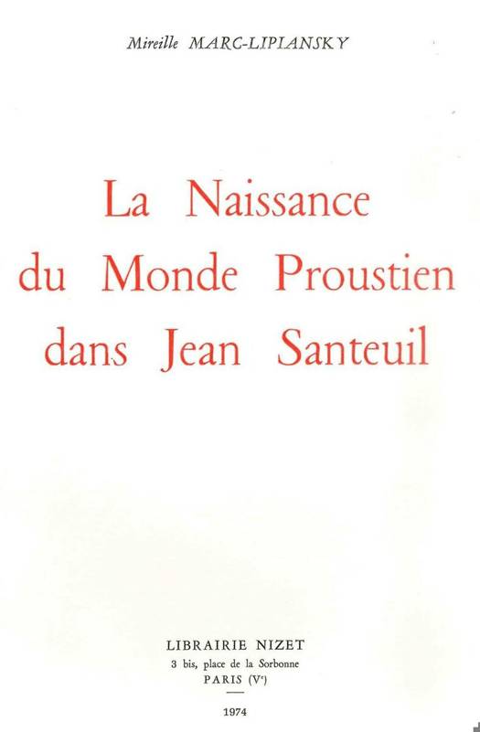 Jean Santeuil, roman inacheve de Marcel Proust, ne fut revele au public qu'en 1952, grace a la decouverte de ses pieces manuscrites par Bernard de Fallois. Les proustiens - meme les plus fervents - ont longtemps neglige ce travail de jeunesse, premiere esquisse pourtant manifeste de LaRecherche. Ce dedain peut bien se comprendre, car ce Jean Santeuil se presente comme un immense amas (pres de mille pages !) de fragments sans liens bien apparents. L'intrigue y semble absente, la composition brille par son desordre, et le style, comme le note Mireille Marc-Lipiansky, "est generalement neglige et souvent banal..." Pourtant, on sait aujourd'hui que Jean Santeuil constitue le plus important document pour la comprehension et l'analyse exacte de A la recherche dutemps perdu de Marcel Proust. Et c'est certainement a la minutieuse etude de Mireille Marc-Lipiansky que l'on doit cette decisive decouverte. En reprenant point par point les "paysages", les "situations", les "themes" et les "personnages" presents dans les deux romans, l'auteur nous revele que les correspondances sont non seulement tres nombreuses, mais encore bien plus etroites qu'on le soupconnait jusqu'alors: "Grace a la decouverte de Jean Santeuil, ecrit-elle, la discontinuite qui semblait caracteriser l'existence et l'oeuvre de Proust, se trouve partiellement reduite (...) Ce document est d'un interet majeur pour les proustiens. Il eclaire en effet la Recherche du temps perdu d'un jour nouveau, en permettant de penetrer le secret de sa fabrication, de suivre pas a pas, dans son lent cheminement, dans ses tatonnements et ses erreurs, la genese d'une oeuvre, dont le Temps retrouve ne nous faisait connaitre que la phase ultime."