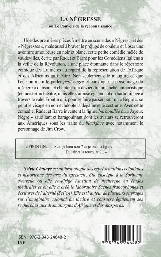 Une des premières pièces à mettre en scène des « Nègres » et des « Négresses », mais aussi à braver le préjugé de couleur et à oser une aventure amoureuse en noir et blanc, cette petite comédie mêlée de vaudevilles, écrite par Radet et Barré pour les Comédiens Italiens à la veille de la Révolution (1787), a une place étonnante dans le répertoire comique des Lumières au regard de la représentation de l’Afrique et des Africains au théâtre. Non seulement elle inaugure ce que l’on nommera le parler petit-nègre et convoque le personnage du « Nègre » dansant et chantant qui deviendra un cliché humoristique (et raciste) au théâtre, mais elle s’amuse également du barbouillage à travers le valet Frontin qui, pour se faire passer pour un « Nègre », se peint le visage en noir et adopte la dégaine et le costume. Avec cette comédie, Radet et Barré inventent la figure barbouillée du « Joyeux Nègre » sautillant et baragouinant dont les avatars se retrouveront aux Amériques sous les traits du blackface avec notamment le personnage de Jim Crow.
