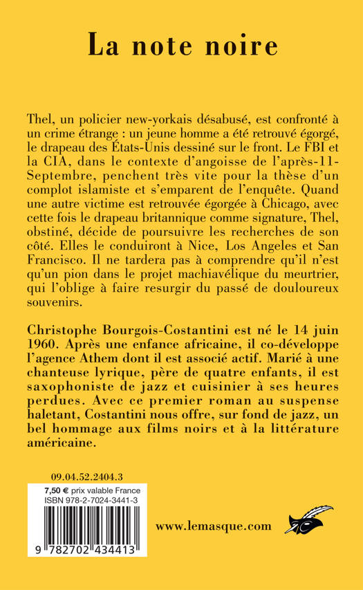 Thel, un policier new-yorkais désabusé, est confronté à un crime étrange : un jeune homme a été retrouvé égorgé, le drapeau des États-Unis dessiné sur le front. Le FBI et la CIA, dans le contexte d’angoisse de l’après-11-Septembre, penchent très vite pour la thèse d’un complot islamiste et s’emparent de l’enquête. Quand une autre victime est retrouvée égorgée à Chicago, avec cette fois le drapeau britannique comme signature, Thel, obstiné, décide de poursuivre les recherches de son côté. Elles le conduiront à Nice, Los Angeles et San Francisco. Il ne tardera pas à comprendre qu’il n’est qu’un pion dans le projet machiavélique du meurtrier, qui l’oblige à faire resurgir du passé de douloureux souvenirs. Avec ce premier roman au suspense haletant, Costantini nous offre, sur fond de jazz, un bel hommage aux films noirs et à la littérature américaine.