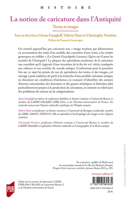Cet ouvrage a pour ambition de partir à la recherche d'une possible caricature antique. Il confronte pour la première fois sur le sujet les points de vue de spécialistes des textes et des images. Il ouvre la discussion sur ses conditions d'existence, en essayant d'identifier des auteurs d'oeuvres caricaturales, des domaines et des genres artistiques et littéraires plus particulièrement propres à la production de caricatures, en mettant en relief aussi des problèmes de sources ou de catégorisations.