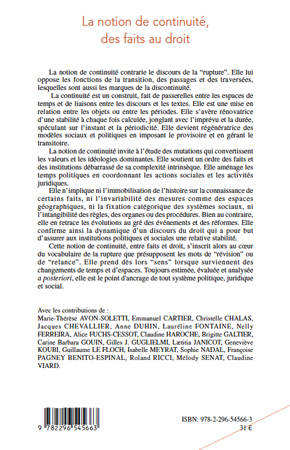 La notion de continuité confirme la dynamique d'un discours du droit qui assure aux institutions politiques et sociales une relative stabilité. Cette notion de continuité, entre faits et droit, s'inscrit au coeur du vocabulaire de la rupture que présupposent les mots de "révision" ou de "relance". Toujours estimée, évaluée et analysée a posteriori, elle est le point d'ancrage de tout système politique, juridique et social.