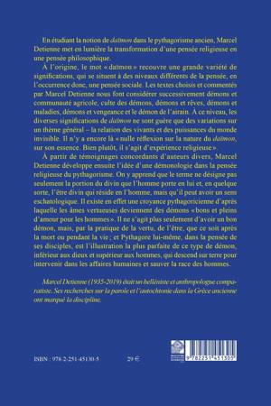 En etudiant la notion de daimon dans le pythagorisme ancien, Marcel Detienne met en lumiere la transformation d'une pensee religieuse en une pensee philosophique. A l'origine, le mot daimon recouvre une grande variete de significations, qui se situent a des niveaux differents de la pensee, en l'occurrence donc, une pensee sociale. Les textes choisis et commentes par Marcel Detienne nous font considerer successivement demons et communaute agricole, culte des demons, demons et reves, demons et maladies, demons et vengeance et le demon de l'airain. A ce niveau, les diverses significations de daimon ne sont guere que des variations sur un theme general - la relation des vivants et des puissances du monde invisible. Il n'y a encore la nulle reflexion sur la nature du daimon, sur son essence. Bien plutot, il s'agit d'experience religieuse . A partir de temoignages concordants d'auteurs divers, Marcel Detienne developpe ensuite l'idee d'une demonologie dans la pensee religieuse du pythagorisme. On y apprend que le terme ne designe pas seulement la portion du divin que l'homme porte en lui et, en quelque sorte, l'etre divin qui reside en l'homme, mais qu'il peut avoir un sens eschatologique. Il existe en effet une croyance pythagoricienne d'apres laquelle les ames vertueuses deviennent des demons bons et pleins d'amour pour les hommes . Il ne s'agit plus seulement d'avoir un bon demon, mais, par la pratique de la vertu, de l'etre, que ce soit apres la mort ou pendant la vie; et Pythagore lui-meme, dans la pensee de ses disciples, est l'illustration la plus parfaite de ce type de demon, inferieur aux dieux et superieur aux hommes, qui descend sur terre pour intervenir dans les affaires humaines et sauver la race des hommes.