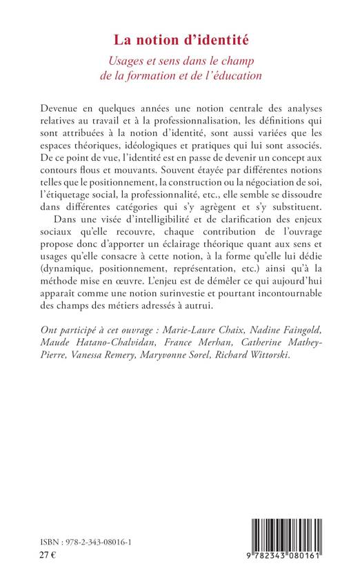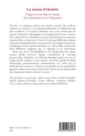 Devenue en quelques années une notion centrale, les définitions qui sont attribuées à la notion d'identité sont aussi variées que les espaces théoriques, idéologiques et pratiques qui lui sont associés. Dans une visée d'intelligibilité et de clarification des enjeux sociaux qu'elle recouvre, ces contributions proposent un éclairage théorique quant aux sens et usages qu'elles consacrent à cette notion d'identité. L'enjeu est de démêler ce qui aujourd'hui apparaît comme une notion surinvestie et pourtant incontournable des champs des métiers adressés à autrui.