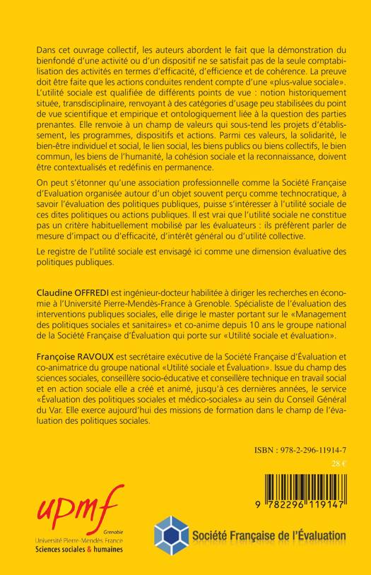 La démonstration du bienfondé d'une activité ou d'un dispositif ne se satisfait pas de la seule comptabilisation des activités en termes d'efficacité, d'efficience et de cohérence. La preuve doit être faite que les actions conduites rendent compte d'une "plus-value sociale". L'utilité sociale est ici qualifiée de différents points de vue ; elle renvoie à un champ de valeurs telles que la solidarité, le bien-être individuel et social, le lien social, les biens publics, la cohésion sociale et la reconnaissance.