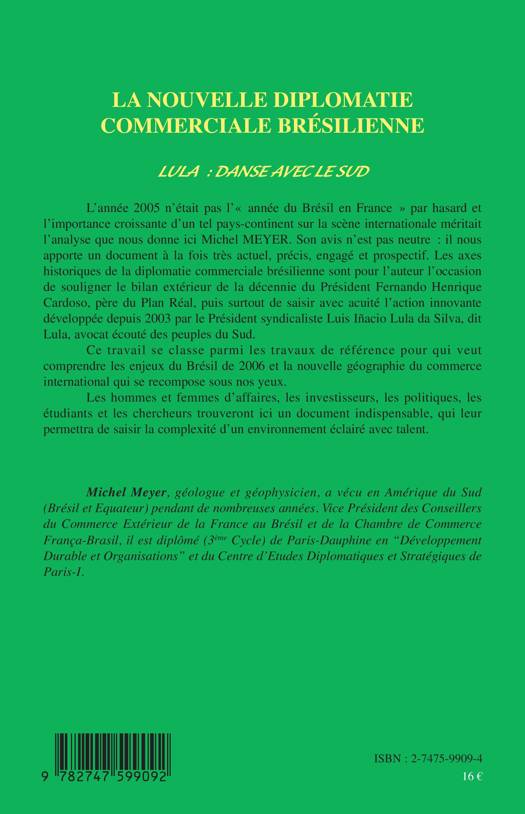 Les axes historiques de la diplomatie commerciale brésilienne sont pour l'auteur l'occasion de souligner le bilan extérieur de la décennie du Président Fernando Henrique Cardoso puis surtout de saisir avec acuité l'action innovante développée depuis 2003 par le Président syndicaliste Luis Inacio Lula da Silva, dit Lula. Ce travail se classe parmi les travaux de référence pour qui veut comprendre les enjeux du Brésil de 2006 et la nouvelle géographie du commerce international qui se recompose sous nos yeux.