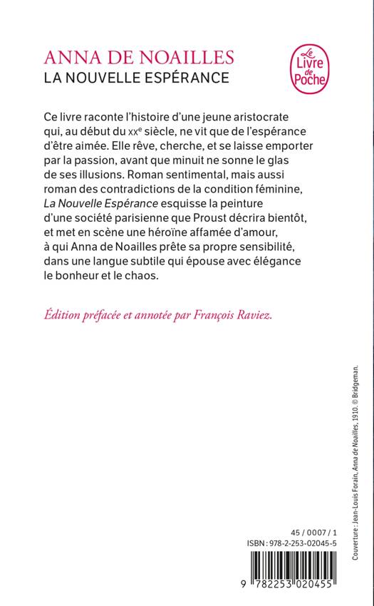Ce livre raconte l’histoire d’une jeune aristocrate qui, au début du XXe siècle, ne vit que de l’espérance d’être aimée. Elle rêve, cherche, et se laisse emporter par la passion, avant que minuit ne sonne le glas de ses illusions. Roman sentimental, mais aussi roman des contradictions de la condition féminine, La Nouvelle Espérance esquisse la peinture d’une société parisienne que Proust décrira bientôt, et met en scène une héroïne affamée d’amour à qui Anna de Noailles prête sa propre sensibilité, dans une langue subtile qui épouse avec élégance le bonheur et le chaos.