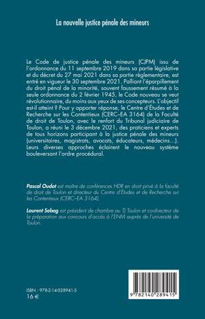 Le Code de justice pénale des mineurs (CJPM) issu de l'ordonnance du 11 septembre 2019 dans sa partie législative et du décret du 27 mai 2021 dans sa partie règlementaire, est entré en vigueur le 30 septembre 2021. Palliant l'éparpillement du droit pénal de la minorité, souvent faussement résumé à la seule ordonnance du 2 février 1945, le Code nouveau se veut révolutionnaire, du moins aux yeux de ses concepteurs. L'objectif est-il atteint ? Pour y apporter réponse, le Centre d'Études et de Recherche sur les Contentieux de la Faculté de droit de Toulon, avec le renfort du Tribunal judiciaire de Toulon, a réuni le 3 décembre 2021, des praticiens et experts de tous horizons participant à la justice pénale des mineurs (universitaires, magistrats, avocats, éducateurs, médecins). Leurs diverses approches éclairent le nouveau système bouleversant l'ordre procédural.