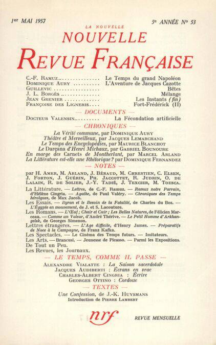 Charles-Ferdinand Ramuz, Le Temps du grand Napoléon Dominique Aury, L'Aventure de Jacques Cazotte Eugčne Guillevic, Bętes Jorge Luis Borges, Mélange Jean Grenier, Les Instants (Fin) Françoise Des Ligneris, Fort-Frédérick (II)