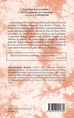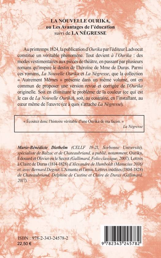 romans qu’inspire le destin de l’héroïne de Mme de Duras. Parmi ces romans, La Nouvelle Ourika et La Négresse, que la collection « Autrement Mêmes » présente dans un même volume, ont en commun de proposer une version revue et corrigée de l’Ourika originelle. Soit en éliminant le problème de la couleur (ce qui est le cas de La Nouvelle Ourika), soit, au contraire, en l’installant, au coeur même de l’oeuvre (ce à quoi s’attache La Négresse).
