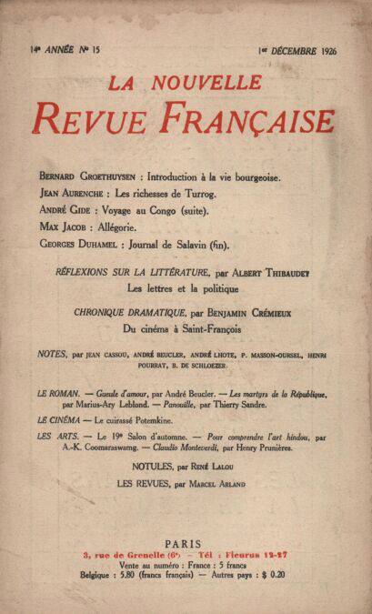 Bernard Groethuysen, Introduction ŕ la vie bourgeoise Jean Aurenche, Les richesses de Turrog André Gide, Voyage au Congo (II) Max Jacob, Allégorie Ils attendent le voyageur Paysage mobile Georges Duhamel, Journal de Salavin (IV)