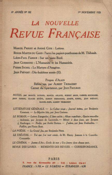 André Gide - Marcel Proust, Lettres Roger Martin du Gard, Parmi les papiers posthumes de M. Thibault Léon-Paul Fargue, Sur un piano Bord Jean Guéhenno, L'Humanité et Ťles Humanitésť Pierre Sichel, Le Martyre d'Anagčne Jean Prévost, Dix-huitičme année (II) Alain, Propos