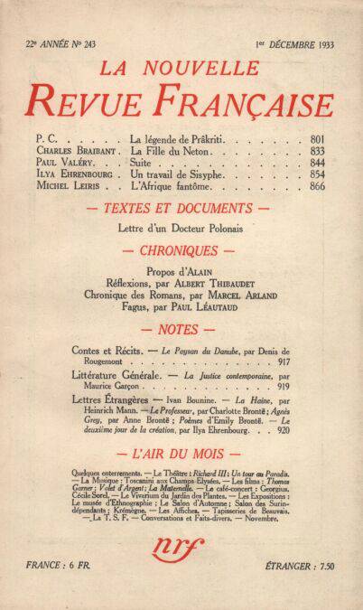 Paul Claudel, La légende de Prâkriti Charles Braibant, La Fille du Neton Paul Valéry, Suite Ilya Ehrenbourg, Un travail de Sisyphe Michel Leiris, L'Afrique fantôme (Fragments) B... S..., Une lettre ŕ André Gide Alain, Propos