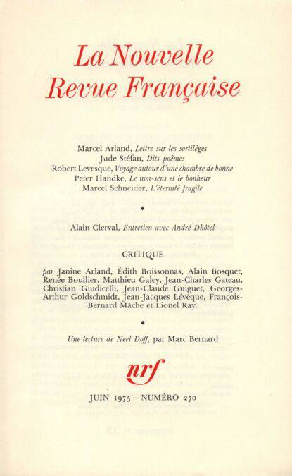Marcel Arland, Lettre sur les sortilèges Jude Stéfan, Dits poèmes Robert Levesque, Voyage autour d'une chambre de bonne Peter Handke, Le non-sens et le bonheur Marcel Schneider, L'éternité fragile André Dhôtel - Alain Clerval, Entretien