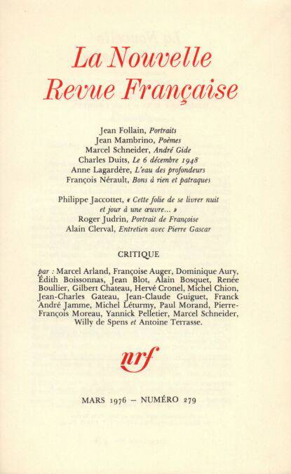 Jean Follain, Portraits Jean Mambrino, Poèmes Marcel Schneider, André Gide Charles Duits, Le 6 décembre 1948 Anne Lagardère, L'eau des profondeurs François Nérault, Bons à rien et patraques Philippe Jaccottet, 'Cette folie de se livrer nuit et jour à une œuvre...' Roger Judrin, Portrait de Françoise Alain Clerval - Pierre Gascar, Entretien