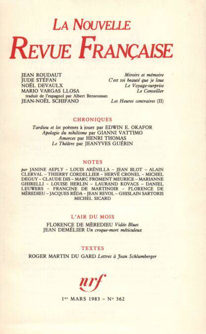 Jean Roudaut, Miroirs et mémoire Jude Stéfan, C'est toi beauté que je loue Noël Devaulx, Le Voyage-surprise Mario Vargas Llosa, Le Conseiller Jean-Noël Schifano, Les Heures contraires (Fin)