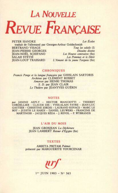 Peter Handke, Les écoles Bertrand Visage, Tous les soleils Jean-Pierre Georges, Dizains disette Jean-Noël Schifano, Les Heures contraires (Fin) Salah Stétié, Les pommes et le désir Jean-Loup Trassard, L'amant de la jeune Targuia (Fin)