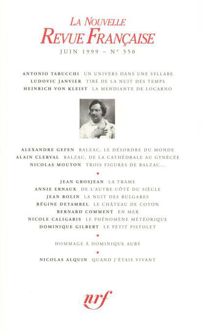 Honoré de Balzac : Alexandre Gefen, Balzac, le désordre du monde Alain Clerval, Balzac, de la cathédrale au gynécée Nicolas Mouton, Trois figures de Balzac : Le père, la mère et l'Étrangère Jean Grosjean, La Trame Annie Ernaux, De l'autre côté du siècle Jean Rolin, La Nuit des Bulgares Régine Detambel, Le Château de coton Bernard Comment, En mer Nicole Caligaris, Le Phénomène météorique Dominique Gilbert, Le Petit Pistolet