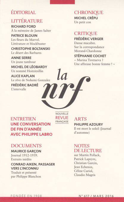 Littérature : Richard Ford, À la mémoire de James Salter Patrice Blouin, Les fleurs du Marvel. Blockbuster et littérature Christophe Boltanski, Le désert des Barbares Anne Serre, Un jeune tambour Michel de Léobardy, Un nommé Hoitzitzillin Alice Kaplan, Le rêve de Nohemi Gonzalez Frédéric Badré, L’intervalle