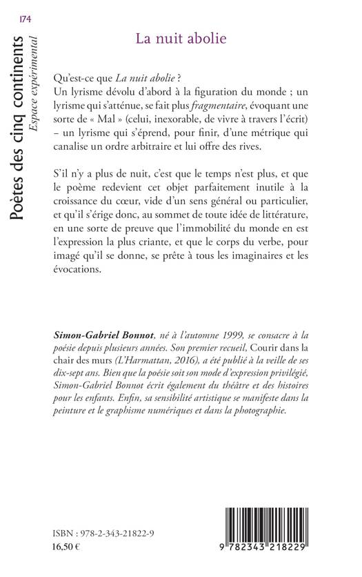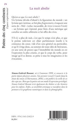 Qu'est-ce que La nuit abolie ? Un lyrisme dévolu d'abord à la figuration du monde; un lyrisme qui s'atténue, se fait plus fragmentaire, évoquant une sorte de Mal (celui, inexorable, de vivre à travers l'écrit) - un lyrisme qui s'éprend, pour finir, d'une métrique qui canalise un ordre arbitraire et lui offre des rives.