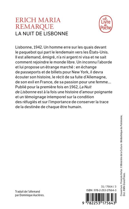 Lisbonne, 1942. Un homme erre sur les quais du port devant le paquebot qui part le lendemain vers les Etats-Unis. Il est emigre allemand, il n'a ni argent ni visa et ne sait comment rejoindre le monde libre. Un inconnu l'aborde et lui propose un etrange marche en echange de passeports et de billets pour New-York, il devra ecouter son histoire, le recit de sa fuite d'Allemagne, de son exil en France, de sa passion pour une femme... Publie pour la premiere fois en 1962, La Nuit de Lisbonne est a la fois une poignante histoire d'amour et un temoignage intemporel sur la condition des refugies et sur l'importance de conserver la trace de la destinee de chaque etre humain.