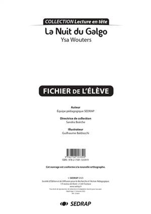 L’ouvrage « La nuit du Galgo » de Ysa Wouters – collection « Lecture en tête » est accompagné d’un fichier pédagogique de 20 fiches de lecture suivie à photocopier, contenant des activités autour du texte, des personnages, du temps et de la narration. Certaines fiches sont également dédiées à la production écrite ou à l’étude de la langue.