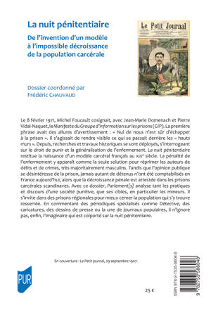 Le 8 février 1971, Michel Foucault cosignait, avec Jean-Marie Domenach et Pierre Vidal-Naquet, le Manifeste du Groupe d’information sur les prisons (GIP). La première phrase avait des allures d’avertissement : « Nul de nous n’est sûr d’échapper à la prison ». Il s’agissait de rendre visible ce qui se passait derrière les « hauts murs ». Depuis, recherches et travaux historiques se sont déployés, s’interrogeant sur le droit de punir et la généralisation de l’enfermement. La nuit pénitentiaire restitue la naissance d’un modèle carcéral français au XIXe siècle. La pénalité de l’enfermement y apparaît comme la seule solution pour réprimer les auteurs de délits et de crimes, très majoritairement masculins. Tandis que l’opinion publique se désintéresse de la prison, jamais autant de détenus n’ont été comptabilisés en France aujourd’hui, alors que la décroissance pénale est attestée dans les prisons carcérales scandinaves. Avec ce dossier, Parlement[s] analyse tant les pratiques et discours d’une société punitive, que ses cibles, en particulier les mineurs. Il s’invite dans des prisons régionales pour mieux cerner la population qui s’y trouve resserrée. En commentant des périodiques spécialisés comme Détective, des caricatures, des dessins de presse ou la une de journaux populaires, il n’ignore pas, enfin, l’imaginaire qui est colporté sur la nuit pénitentiaire.