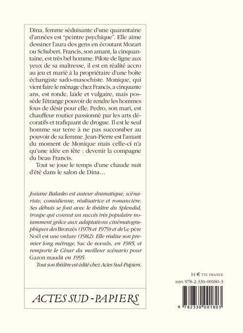 Josiane Balasko nous entraîne dans le salon de Dina, "peintre psychique", le temps d'une soirée où mensonges, quiproquos, tromperies, chantages, bagarres et poursuites s'enchaînent dans un rythme effréné. Un jeu de rôles et de passions, de plus en plus vertigineux et périlleux.