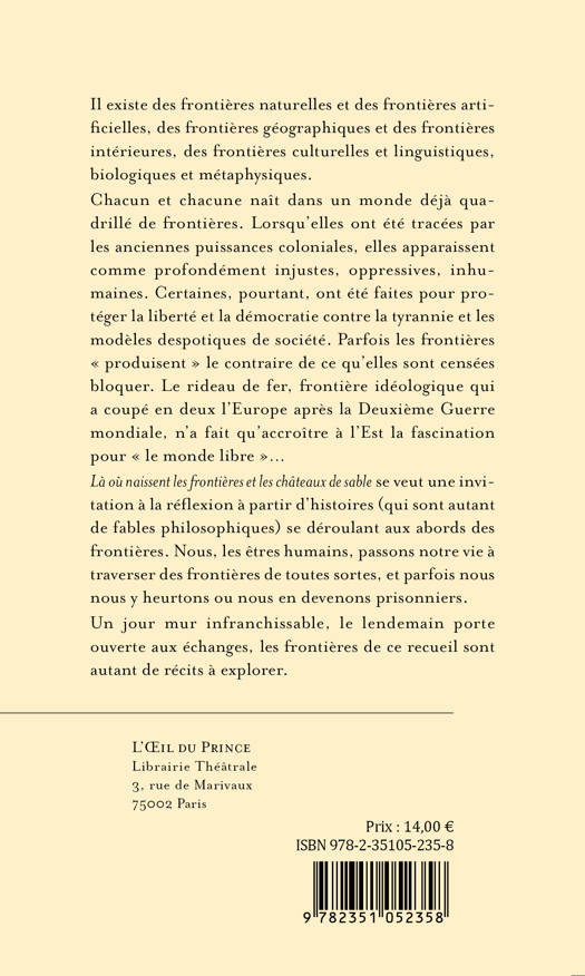 Là où naissent les frontières et les châteaux de sable se veut une invitation à la réflexion à partir d’histoires (qui sont autant de fables philosophiques) se déroulant aux abords des frontières. Nous, les êtres humains, passons notre vie à traverser des frontières de toutes sortes, et parfois nous nous y heurtons ou nous en devenons prisonniers.