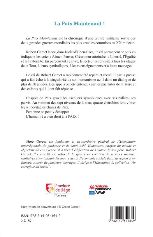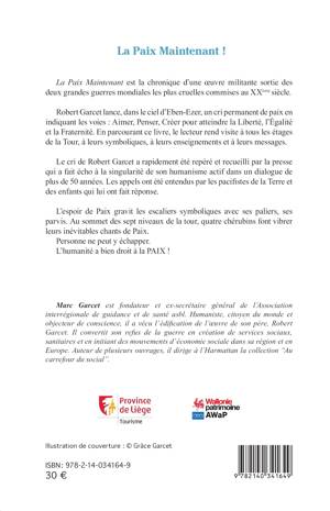 La Paix Maintenant est la chronique d'une uvre militante sortie des deux grandes guerres mondiales les plus cruelles commises au XXème siècle. Robert Garcet lance, dans le ciel d'Eben-Ezer, un cri permanent de paix en indiquant les voies : Aimer, Penser, Créer pour atteindre la Liberté, l'Égalité et la Fraternité. En parcourant ce livre, le lecteur rend visite à tous les étages de la Tour, à leurs symboliques, à leurs enseignements et à leurs messages. Le cri de Robert Garcet a rapidement été repéré et recueilli par la presse qui a fait écho à la singularité de son humanisme actif dans un dialogue de plus de 50 années. Les appels ont été entendus par les pacifistes de la Terre et des enfants qui lui ont fait réponse. L'espoir de Paix gravit les escaliers symboliques avec ses paliers, ses parvis. Au sommet des sept niveaux de la tour, quatre chérubins font vibrer leurs inévitables chants de Paix. Personne ne peut y échapper. L'humanité a bien droit à la PAIX !
