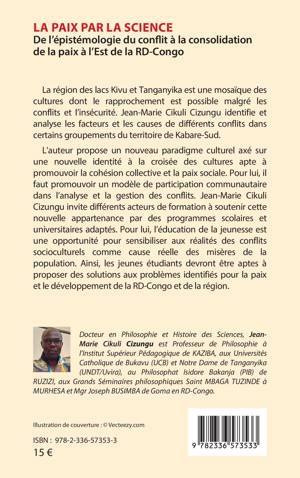La région des lacs Kivu et Tanganyika est une mosaïque des cultures dont le rapprochement est possible malgré les conflits et l'insécurité. Jean-Marie CIKULI Cizungu identifie et analyse les facteurs et les causes de différents conflits dans certains groupements du territoire de Kabare-Sud. L'auteur propose un nouveau paradigme culturel axé sur une nouvelle identité à la croisée des cultures apte à promouvoir la cohésion collective et la paix sociale. Pour lui, il faut promouvoir un modèle de participation communautaire dans l'analyse et la gestion des conflits. Jean-Marie CIKULI Cizungu invite différents acteurs de formation à soutenir cette nouvelle appartenance par des programmes scolaires et universitaires adaptés. Pour lui, l'éducation de la jeunesse est une opportunité pour sensibiliser aux réalités des conflits socioculturels comme cause réelle des misères de la population. Ainsi, les jeunes étudiants devront être aptes à proposer des solutions aux problèmes identifiés pour la paix et le développement de la RD-Congo et de la région.