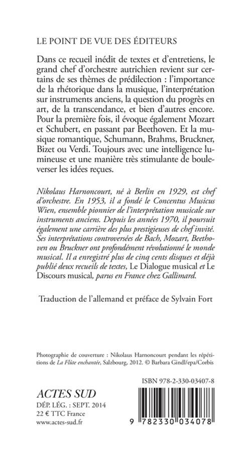 Dans ce recueil inédit de textes et d'entretiens, le grand chef d'orchestre autrichien revient sur certains de ses thèmes de prédilection : l'importance de la rhétorique dans la musique, l'interprétation sur instruments anciens, la question du progrès en art, de la transcendance, et bien d'autres encore. Pour la première fois, il évoque également Mozart et Schubert, en passant par Beethoven. Et la musique romantique, Schumann, Brahms, Bruckner, Bizet ou Verdi. Toujours avec une intelligence lumineuse et une manière très stimulante de bouleverser les idées reçues.