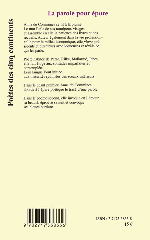 Dans le chant premier, Anne de Commines aborde à l'épure poétique le tracé d'une parole. Dans le poème second, elle invoque en l'amour sa beauté, éprouve sa nuit et convoque ses bleues bordures.