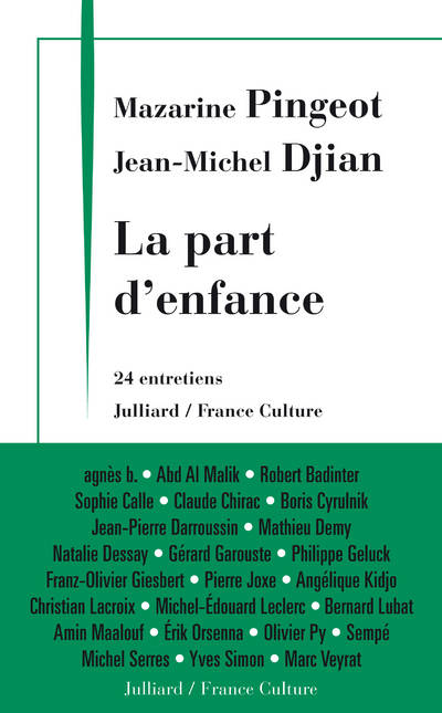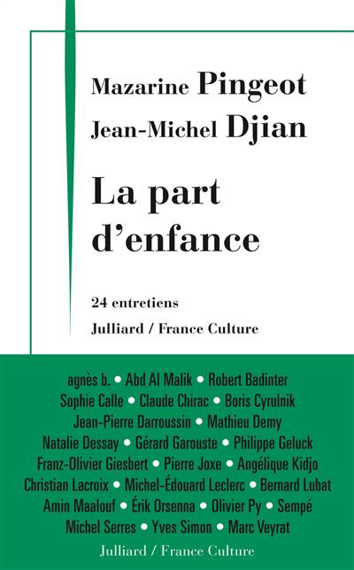 Le temps d'un été, Mazarine Pingeot et Jean-Michel Djian ont mené une série d'entretiens avec des personnalités de tous horizons dans une émission intitulée " La part d'enfance ", diffusée quotidiennement sur France Culture. Pour chaque invité, il n'était pas question de faire la promotion d'un livre, d'un film, d'un album ou d'une exposition, ni même de réagir à une actualité brûlante, mais tout simplement d'évoquer son enfance, sur le ton de la confidence. Des conversations intimes qui ont révélé la naissance d'un destin, la fabrique d'une ambition.