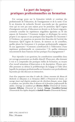 Cet ouvrage porte sur la formation initiale et continue des professionnels de l'éducation, de l'enseignement, de la santé. Côté apprenant : comment concilier les expériences singulières égrainées au fil des espaces de formation? Côté formateur : quelle place donner à l'apprenant ? Comment contribuer à la construction d'une expérience professionnelle ? A quelles résistances ont-ils à faire face ? L'ouvrage permet de comprendre les pratiques de formation, tout en considérant avec sérieux la thèse selon laquelle le langage impacte les pratiques professionnelles en formation.
