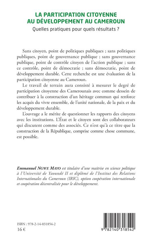 Sans citoyen, point de politiques publiques; sans politiques publiques, point de gouvernance publique; sans gouvernance publique, point de contrôle citoyen de l'action publique; sans ce contrôle, point de démocratie; sans démocratie, point de développement durable. Cette recherche est une évaluation de la participation citoyenne au Cameroun. Le travail de terrain aura consisté à mesurer le degré de participation citoyenne des Camerounais avec comme dessein de contribuer à la construction d'un héritage commun qui renforce les acquis du vivre ensemble, de l'unité nationale, de la paix et du développement durable. L'ouvrage a le mérite de questionner les rapports des citoyens avec les institutions. L'État et le citoyen sont des collaborateurs qui discutent comme des associés. Ce n'est qu'à ce titre que la construction de la République, comprise comme chose commune, est possible.