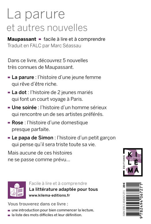 UN LIVRE FACILE À LIRE ET À COMPRENDRE Dans ce livre, découvrez 5 nouvelles très connues de Maupassant. -La parure : L’histoire d’une jeune femme qui rêve d’être riche. -La dot : L’histoire de 2 jeunes mariés qui font un court voyage à Paris. -Une soirée : L’histoire d’un homme sérieux qui rencontre un de ses artistes préférés. -Rose : L’histoire d’une servante presque parfaite. -Le papa de Simon : L’histoire d’un petit garçon qui pense qu’il sera triste toute sa vie. Mais aucune de ces histoires ne se passe comme prévu…