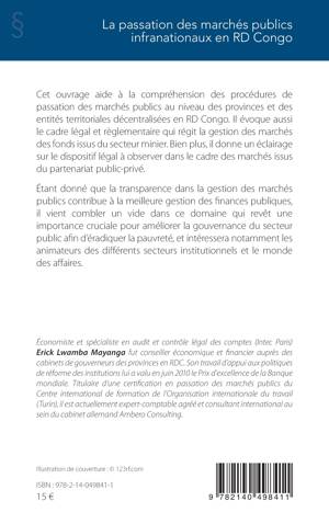 Cet ouvrage aide à la compréhension des procédures de passation des marchés publics au niveau des provinces et des entités territoriales décentralisées en RD Congo. Il évoque aussi le cadre légal et règlementaire qui régit la gestion des marchés des fonds issus du secteur minier. Bien plus, il donne un éclairage sur le dispositif légal à observer dans le cadre des marchés issus du partenariat public-privé. Étant donné que la transparence dans la gestion des marchés publics contribue à la meilleure gestion des finances publiques, il vient combler un vide dans ce domaine qui revêt une importance cruciale pour améliorer la gouvernance du secteur public afin d'éradiquer la pauvreté, et intéressera notamment les animateurs des différents secteurs institutionnels et le monde des affaires.
